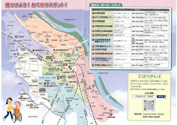 魅力いっぱいの中原区!いろいろな場所に足を運んでおでかけを楽しんでいただきたく、地図を作成しました。いこいの家や図書館、生涯学習プラザ等の場所が地図上でパッと分かります。